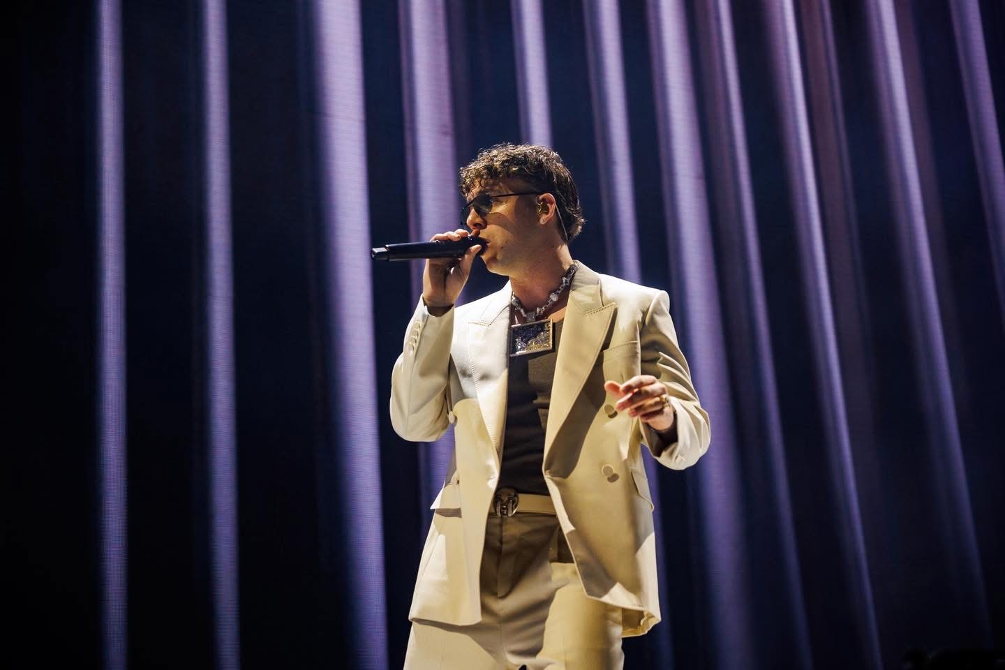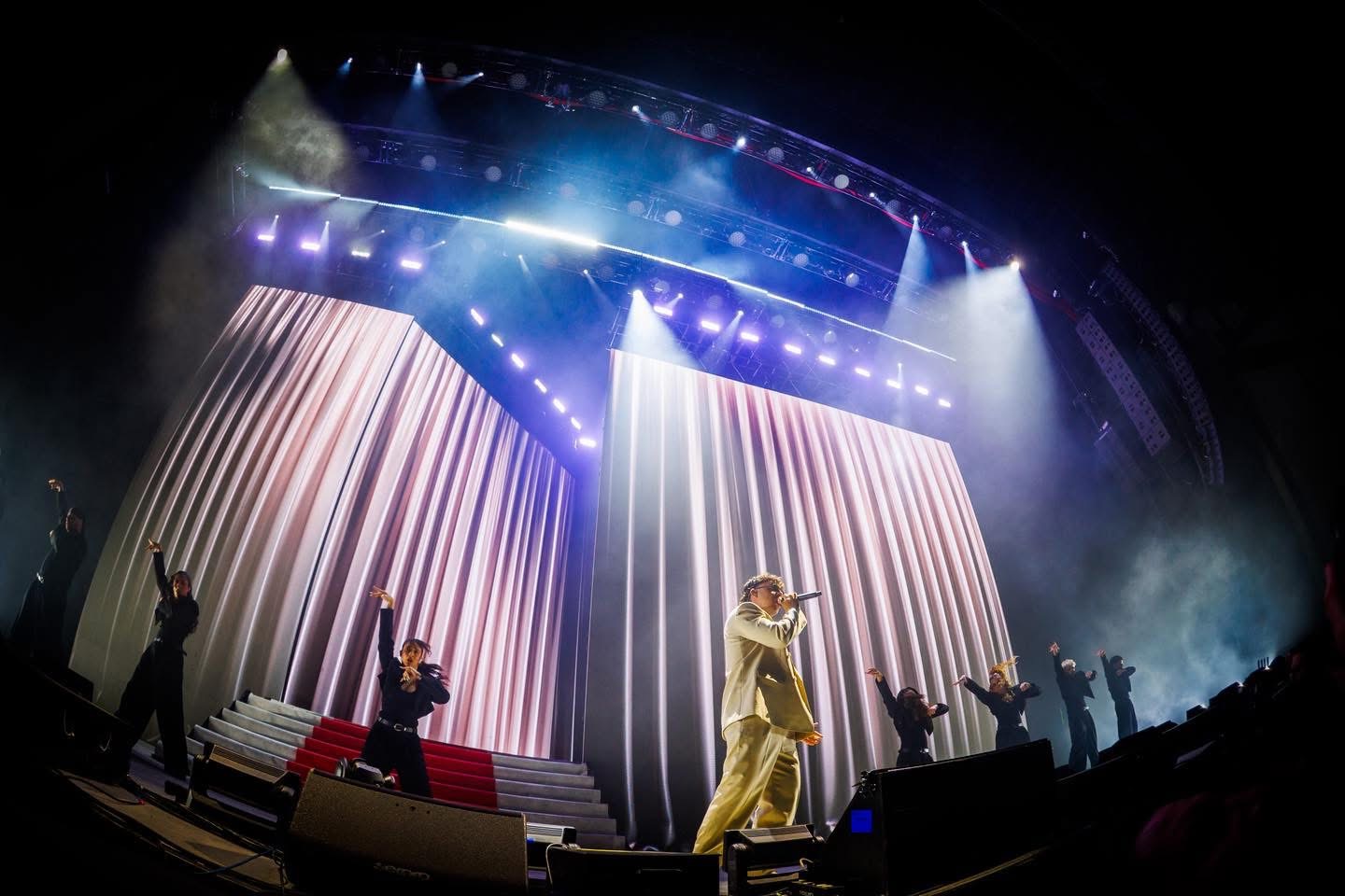 El reloj marco las 21:09 y el show dio inicio , poco a poco fue bajando Quevedo por unas escaleras colocada en el escenario para interpretar “Kassandra”.