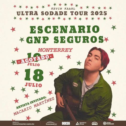 Después de que la primera fecha se agotara en tiempo récord, Kevin Kaarl regresa a Monterrey con dos noches para sus fans los días 18 y 19 de julio de 2025 en el Escenario GNP Seguros. La gran demanda hizo que se sumara una segunda función para que nadie se quede sin disfrutar de este talentoso cantautor.