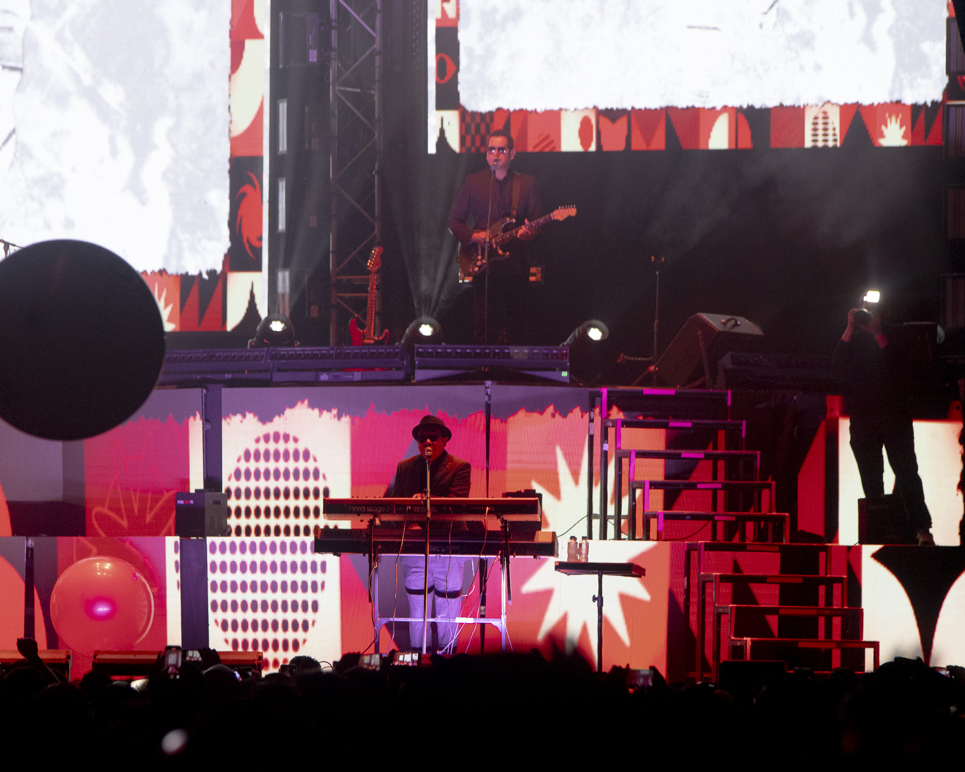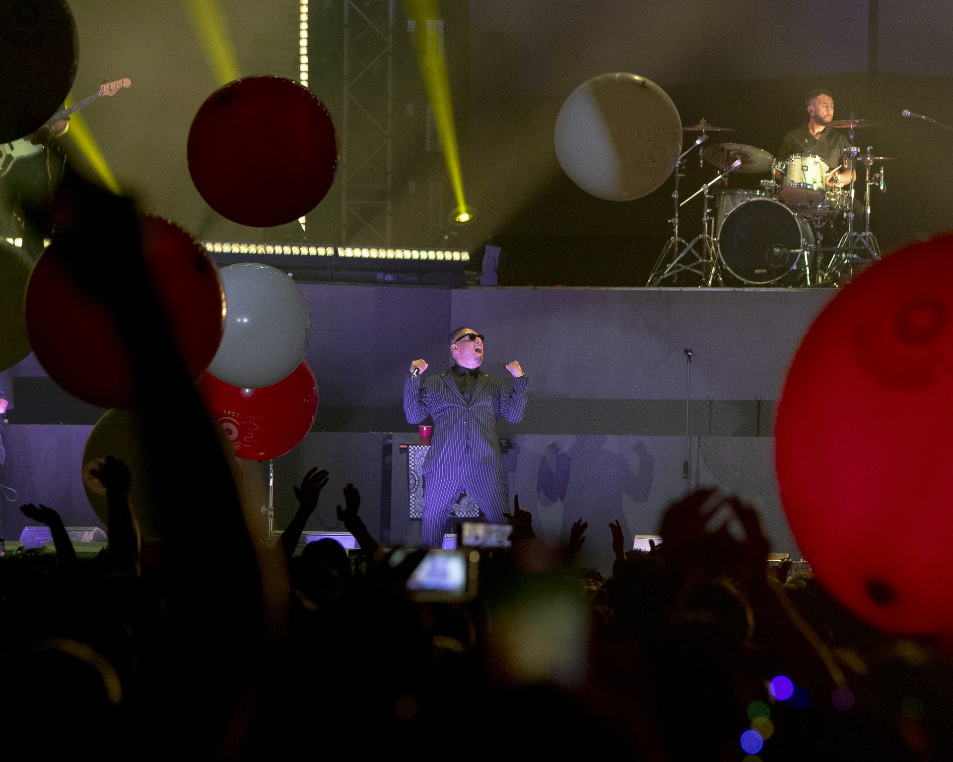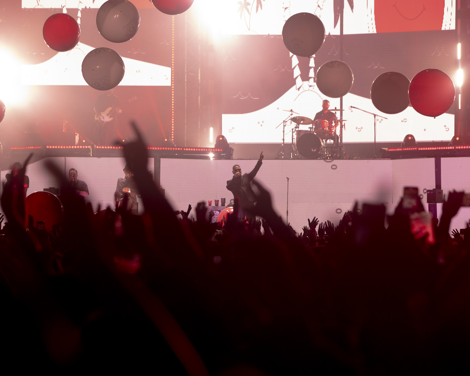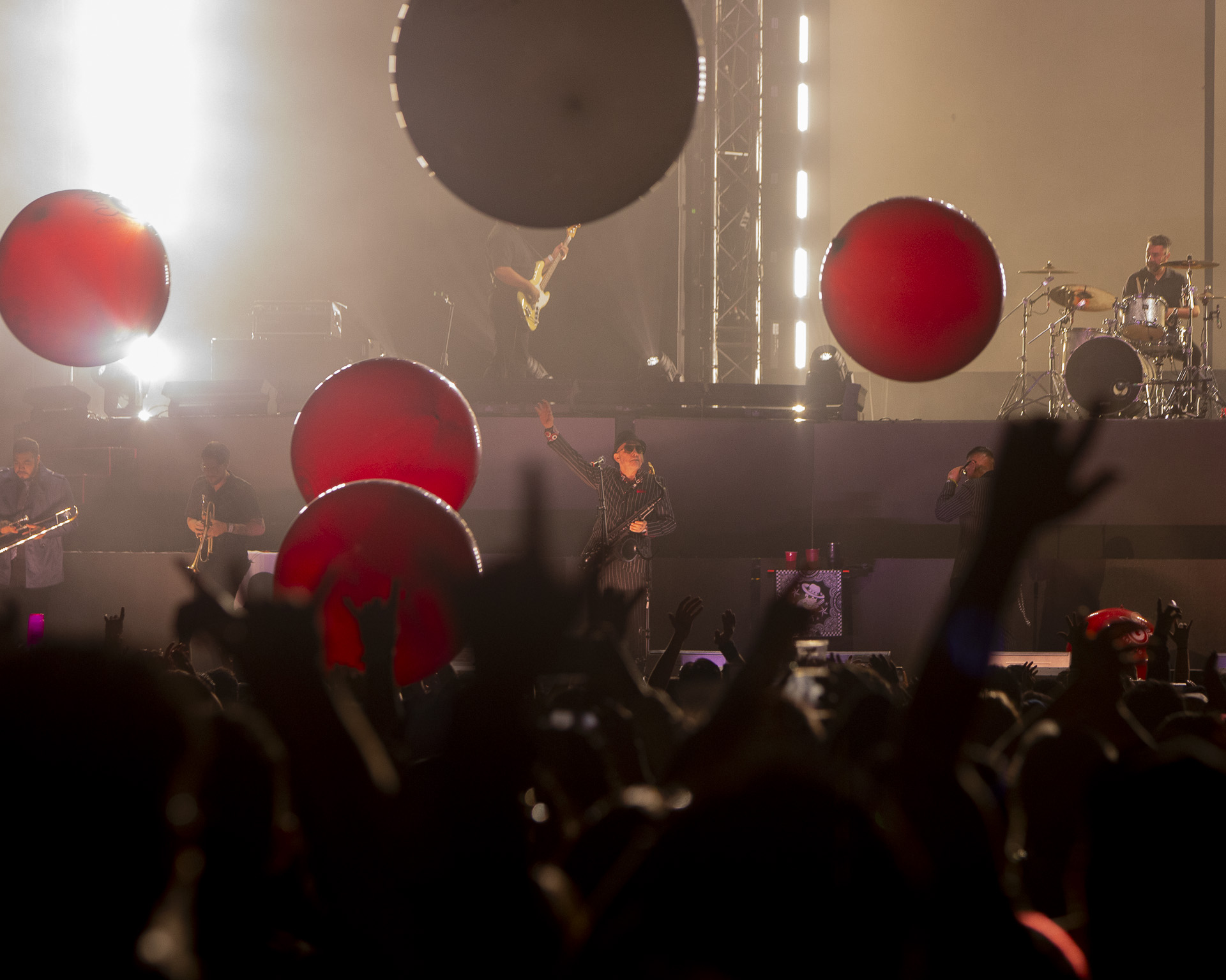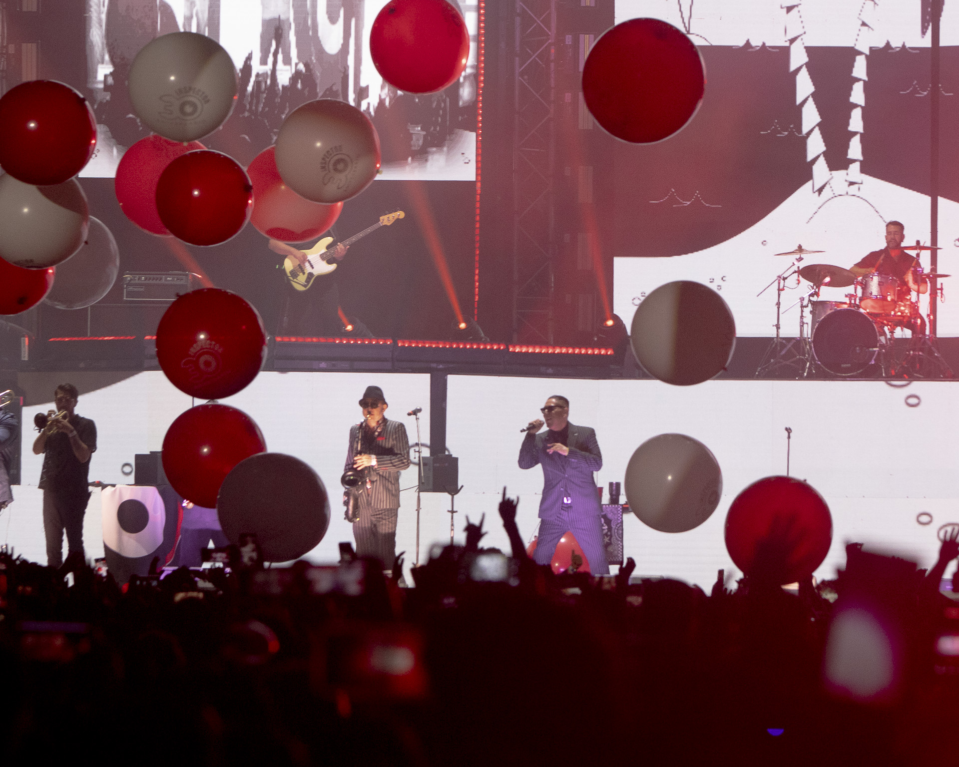 La producción fue de primer nivel: un escenario de dos niveles y pantallas gigantes que iluminaron cada rincón del recinto. Desde el arranque, el ambiente fue de euforia total. Al sonar los primeros acordes, enormes pelotas rebotaron sobre el público, marcando el inicio de una noche inolvidable.