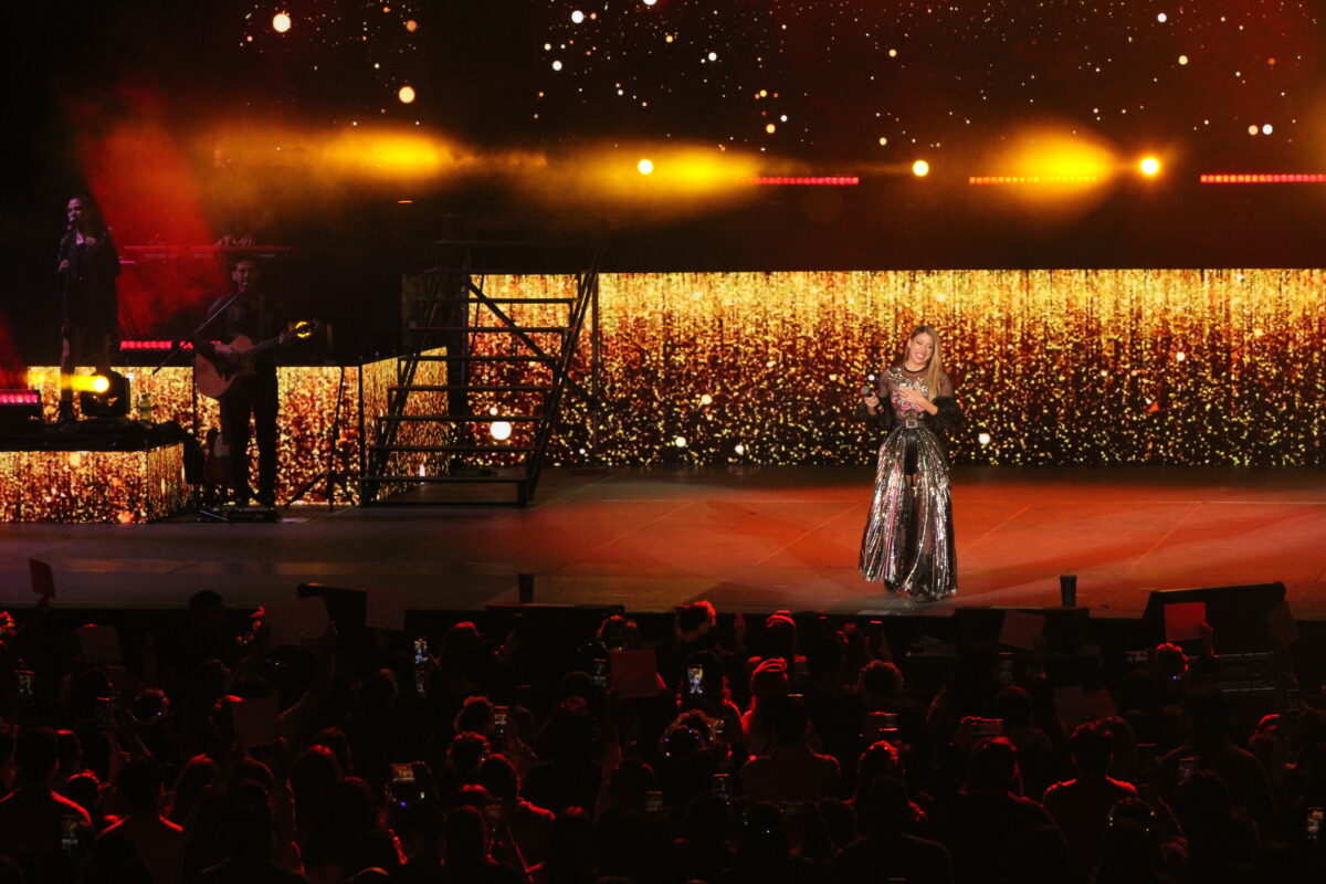 Y entonces llegó el momento más esperado: “Flores Amarillas”. La cantante apareció con un vestuario amarillo “por supuesto”, bromeó y el recinto entero cantó al unísono, como si la nostalgia se hubiese convertido en una sola voz.