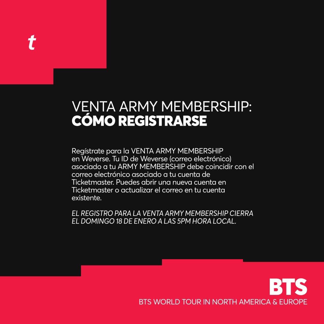 La venta de boletos se realizará en varias fases: primero con preventa para miembros ARMY Membership, que requiere registro previo para acceder a la compra anticipada, y después con la venta general, disponible para todos los fans interesados. Para registrarte en la ARMY Membership, puedes hacerlo a través de las plataformas oficiales del grupo, lo cual te permitirá participar en preventas y obtener mejores lugares antes que el público general.