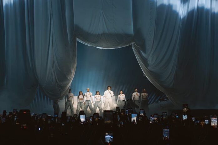 La producción giró completamente alrededor del concepto del cielo: nubes flotando, arcoíris, auroras boreales, luces LED y láseres que envolvían cada canción con una atmósfera mágica.